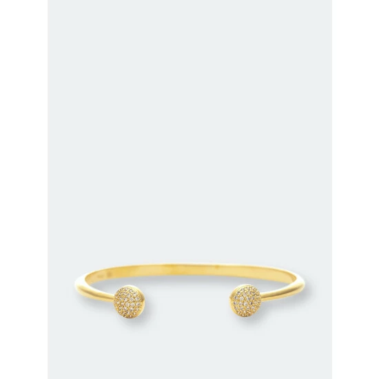 This Rivka Friedman 18K gold clad open bangle bracelet has a polished finish and features 2 pave Cubic Zirconia bead end caps. This bangle is perfect worn alone or layered with other Rivka designs. Fits most wrist sizes.