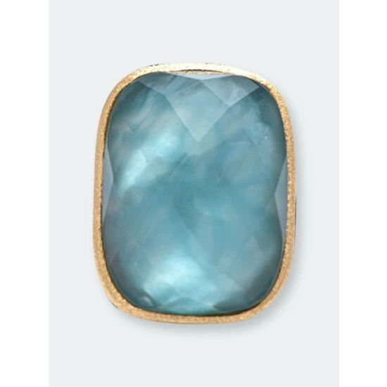 – 18k gold clad faceted denim blue + mother of pearl doublet crystal rectangle satin cocktail ring + round cabochon side accent stone- Measures: 32x 23 MM