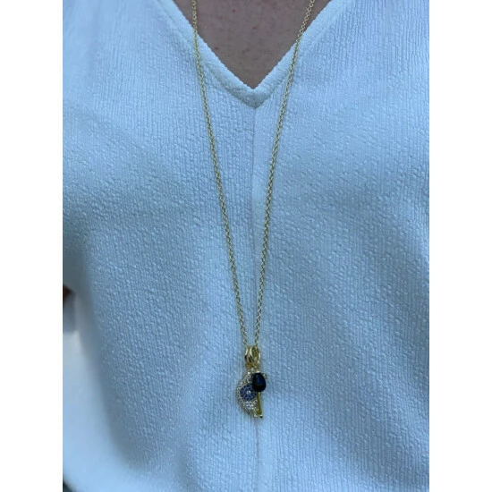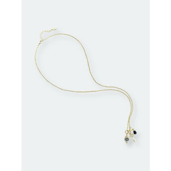 18k gold clad chain with cz encrusted key + onyx bead + white & blue cubic zirconia evil eye charm necklace