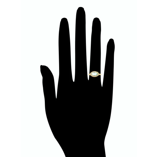 This rivka friedman 18k gold clad ring features an east/west horiztontal set marquise cut london blue crystal surrounded by bezel set cubic zirconia stones. This ring also features a beaded shank design.