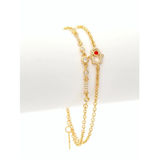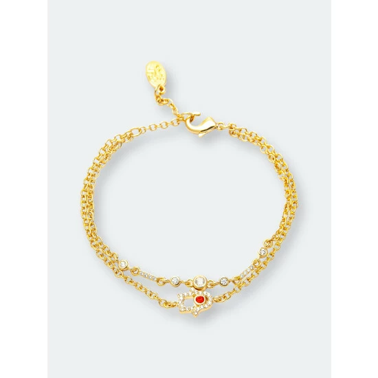 This rivka friedman 18k gold clad bracelet features double chain strands set with a cz encrusted hamsa charm with a rubelite crystal center as well as bezel set cz accents. This bracelet is secured by a lobster clasp and features an extender for ease of wear.