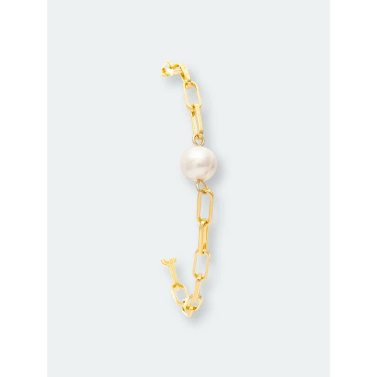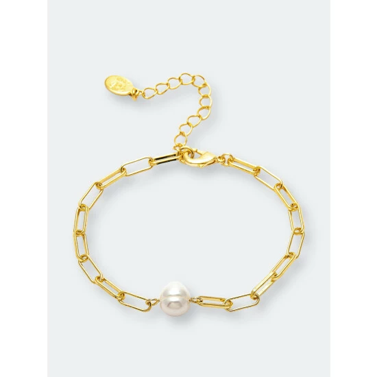 This Rivka Friedman 18K Gold Clad link bracelet features a polished paper clip chain motif with a freshwater pearl center acent. This bracelet has lobster clasp closure and an extender for ease of wear.