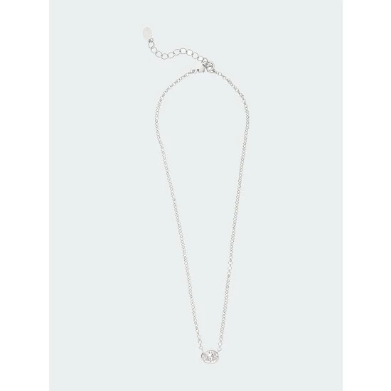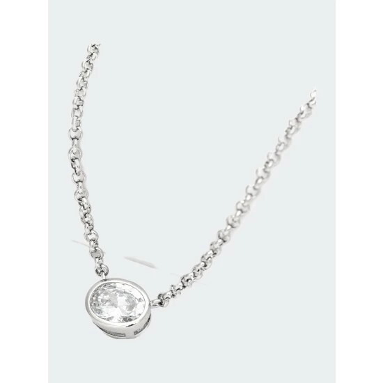 This White Rhodium clad Rivka Friedman pendant features a single bezel set horizontal oval Cubic Zirconia on a cable chain. This necklace has lobster clasp closure and an extender for ease of wear.