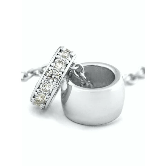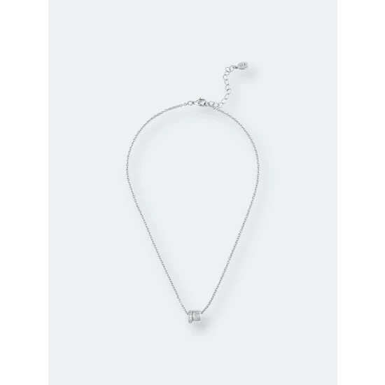 This rivka friedman 18k white rhodium clad necklace features a rolo link chain with with a cubic zirconia pave ring charm and a polished ring charm. 18k white rhodium clad rolo chain with cz pave ring & polished ring necklace