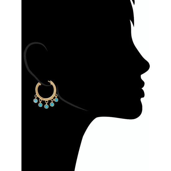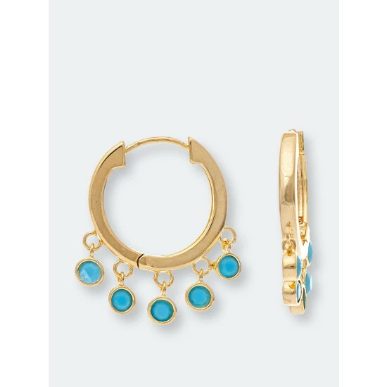 18K Gold Clad Turquoise Crystal Dangle Earrings with Latch Back ClosureThese Rivka Friedman hoop earrings are clad in 18K gold and feature dangling turquoise crystal accents. These earrings are secured with latch closure and are for pierced ears only.