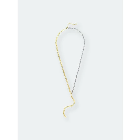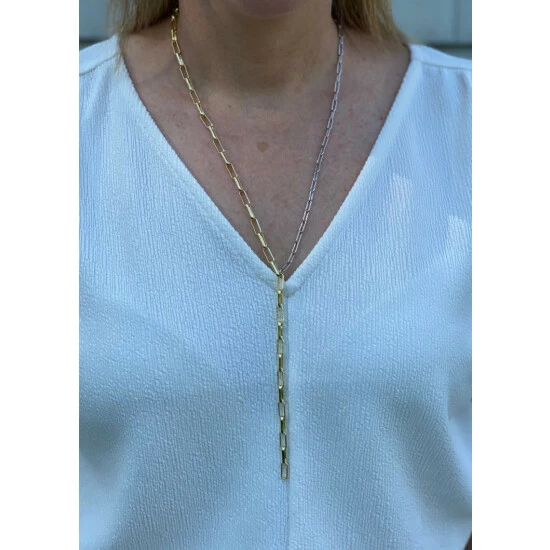 This Rivka Friedman necklace features two-tone metal in a 18K yellow gold clad and White Rhodium clad paper clip motif. This lariat chain style necklace measures 27″ in length.